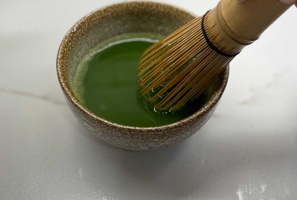 5. Pour the heated water into the bowl with the matcha & whisk together until bubbles appear.